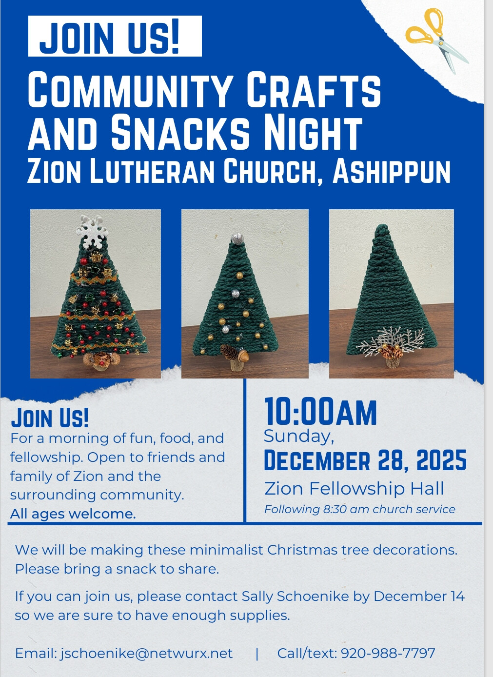 Worship is held each each week at 8:30 am at Zion. Special worship events are listed on the calendar.
